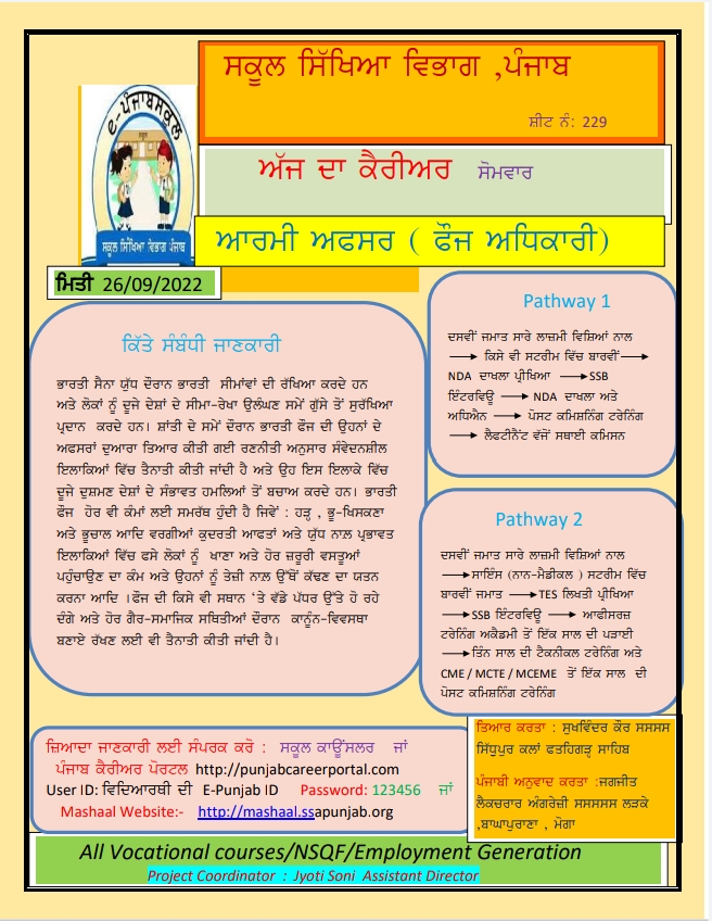ਅੱਜ ਦਾ ਕਰੀਅਰ 229- ਆਰਮੀ ਅਫਸਰ 26.09.2022